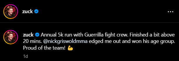 “Finished a bit above 20 mins,” Zuckerberg shared on social media, adding that teammate Nick Griswold “edged me out and won his age group.” The tech billionaire concluded his post with a message of pride for his team, accompanied by a flexed arm emoji.