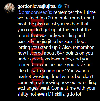 The reigning ADCC champion continued his response by challenging Reed’s wrestling credentials: “Remember how I scored about 847 points on you under ADCC takedown rules, and you scored 0 on me because you have no idea how to scrimmage? You wanna market wrestling, fine by me, but don’t come at me knowing how our wrestling exchanges went. Come at me with your not even D1 skills, gtfo lol.”
