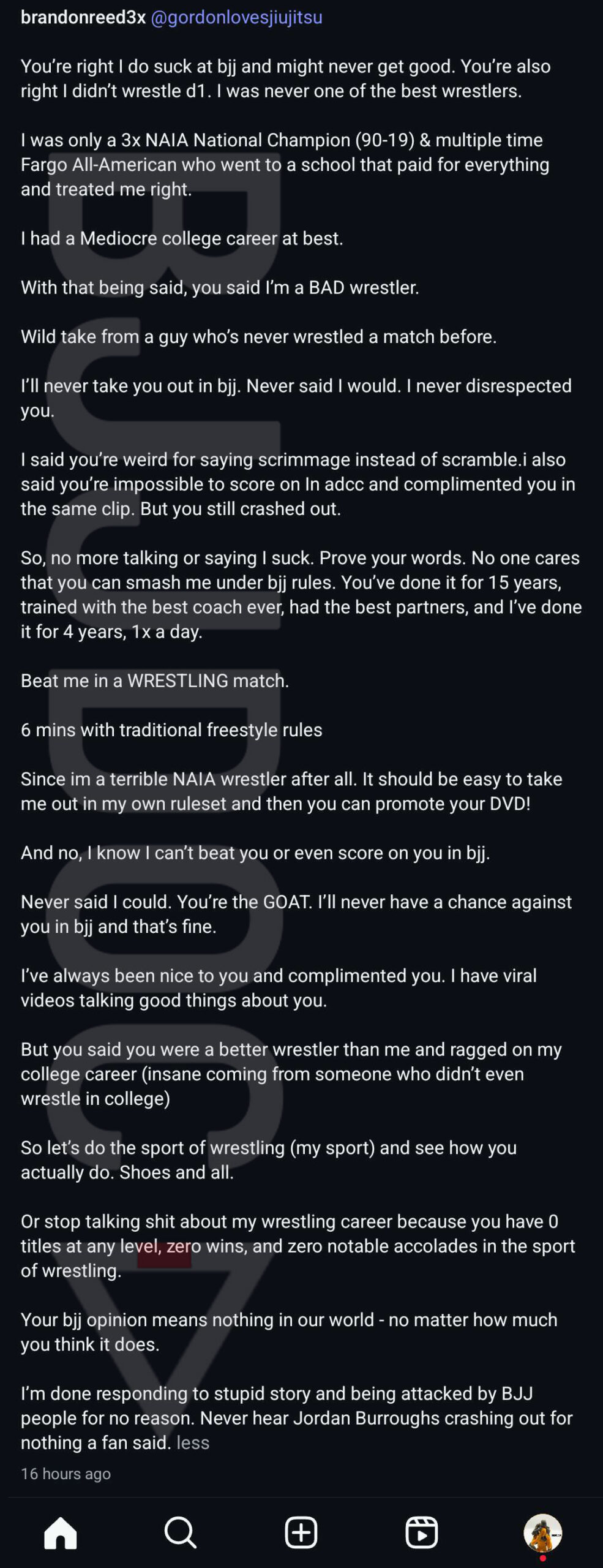 “I’ll never take you out in bjj. Never said I would. I never disrespected you,” Reed wrote. “I said you’re weird for saying scrimmage instead of scramble. I also said you’re impossible to score on in ADCC and complimented you in the same clip.”