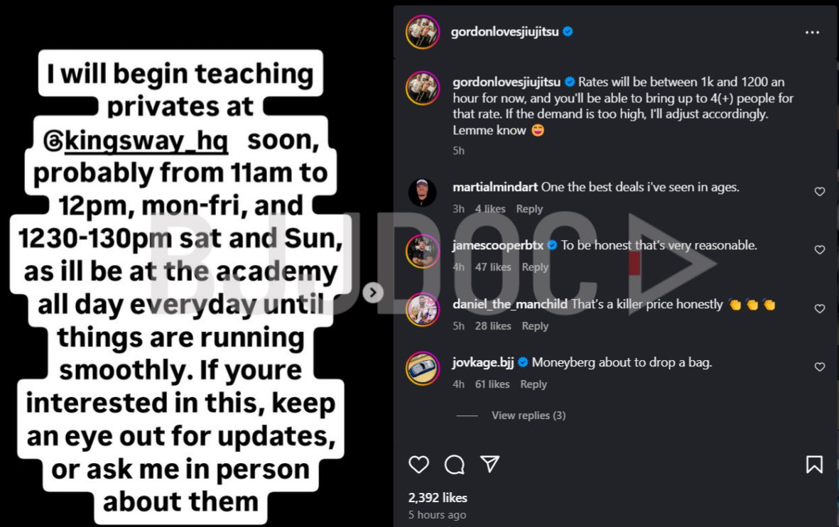 The ADCC champion revealed on Instagram that he would begin offering daily private lessons at Kingsway HQ charging between $1,000 to $1,200 per hour for sessions that can accommodate up to four students.