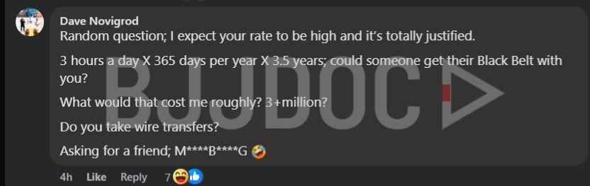 “3 hours a day X 365 days per year X 3.5 years; could someone get their Black Belt with you? What would that cost me roughly? 3+million? Do you take wire transfers? Asking for a friend; M****B****G.”