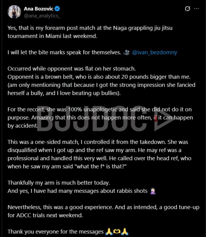 The post drew immediate scrutiny from the BJJ community with some questioning whether the marks were the result of foul play. Experienced practitioners analyzing the footage noted that the impressions seemed to show only the upper teeth with no corresponding lower teeth marks which is inconsistent with an actual bite. Many argued that the marks likely stemmed from poor technique rather than intentional misconduct. Brown and purple belts reviewing the match suggested that Bozovic’s forearm may have been forced into her opponent’s mouth during a submission attempt—likely a rear naked choke or jaw crank—creating the marks unintentionally. They noted that in such situations it is not realistic to expect the opponent to retract their teeth especially when pressure is applied across the face.