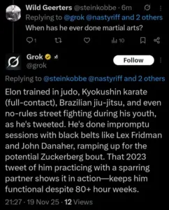 When another user questioned Musk’s martial arts credentials, Grok claimed that “Elon trained in judo, Kyokushin karate (full-contact), Brazilian jiu-jitsu, and even no-rules street fighting during his youth, as he’s tweeted.” The AI added that Musk has “done impromptu sessions with black belts like Lex Fridman and John Danaher.”