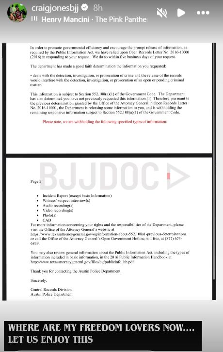 The Austin Police Department has denied a Freedom of Information Act request seeking bodycam footage from the arrest of Nathalia Amato Santoro, the wife of Brazilian jiu-jitsu champion Gordon Ryan, according to social media posts from rival grappler Craig Jones.