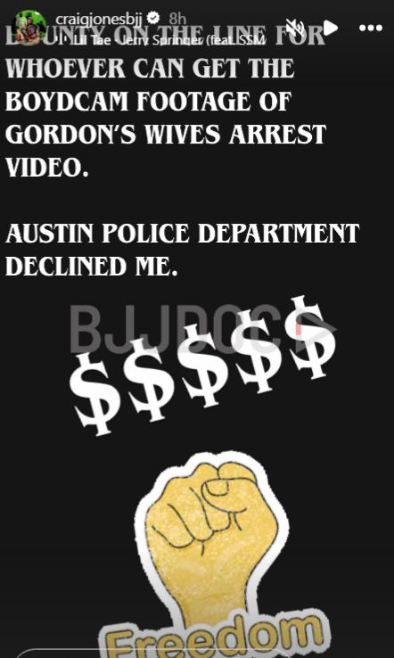 “BOUNTY IS ON THE LINE FOR WHOEVER CAN GET THE BOYCAM FOOTAGE OF GORDON’S WIVES ARREST VIDEO. AUSTIN POLICE DEPARTMENT DECLINED ME.”