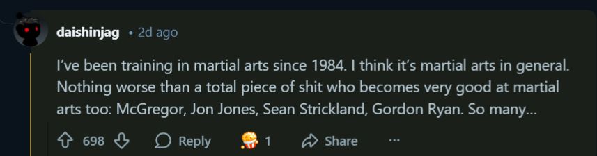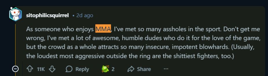 “As someone who enjoys MMA, I’ve met so many a**holes in the sport. Don’t get me wrong, I’ve met a lot of awesome, humble dudes who do it for the love of the game but the crowd as a whole attracts so many insecure, impotent blowhards.”