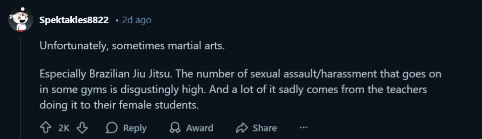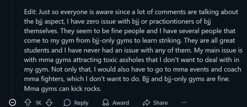 Some practitioners pushed back, arguing that BJJ-only schools and traditional martial arts gyms maintain more positive cultures. This suggests the problem lies not in the arts themselves but in environments that reward ego over respect.