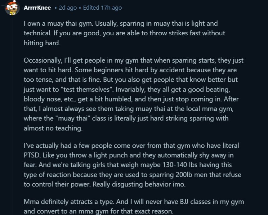 Criticism goes beyond personality issues. One muay thai gym owner described a pattern that changed how they run their business. They explained that sparring is usually light and technical in their discipline. Skilled practitioners throw strikes with speed while maintaining control.
