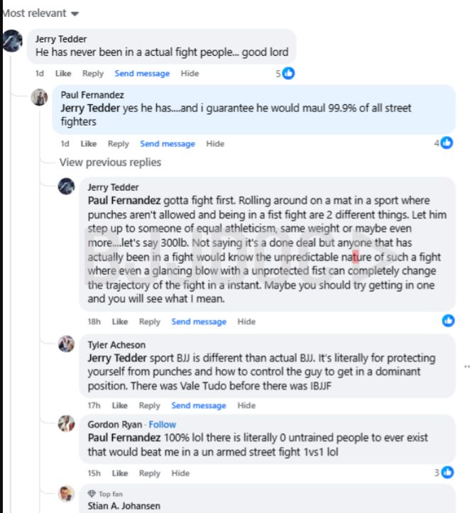 The jiu-jitsu community’s response has been mixed. Some practitioners see the similar talking points as coincidental. After all, trained grapplers have been saying untrained people are helpless against them since the first UFC. Others think the near-identical phrasing and examples are too similar to be accidental.