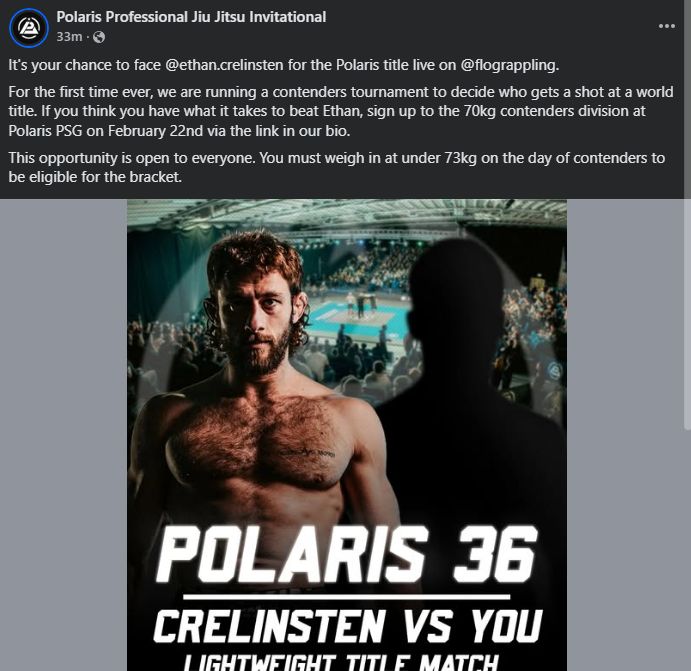 Polaris Professional Jiu Jitsu Invitational announced this week that for the first time in the promotion’s history it will run an open contenders tournament to determine who earns a chance at the 154 lbs (70 kg) title against Ethan Crelinsten. Framed publicly as an opportunity for emerging talent, the move reads more like a cost saving adjustment from a promotion struggling to stay relevant in an increasingly saturated BJJ market.