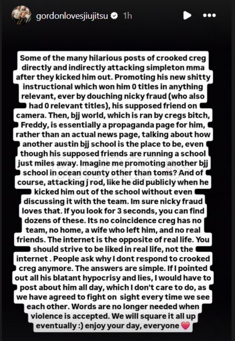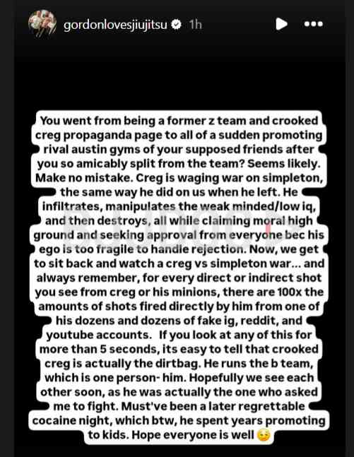 The larger problem for Gordon Ryan is not Craig Jones. It is that his online presence no longer carries the weight it once did. The signal has been drowned out by a steady stream of influencer slop: culture bait, grievance posting, and commentary aimed less at the jiu jitsu world than at an aging, algorithm ridden MAGA audience far removed from the mats. Ryan’s public output has grown increasingly disconnected from what is actually happening in grappling.