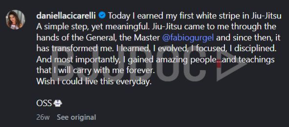 “I started Jiu-Jitsu after a conversation with the General @fabiogurgel and since then, I fell more in love each day,” she wrote on social media. “I intensified training, dedication and thoughts, and today I climbed the first step of the ladder I chose to follow.”