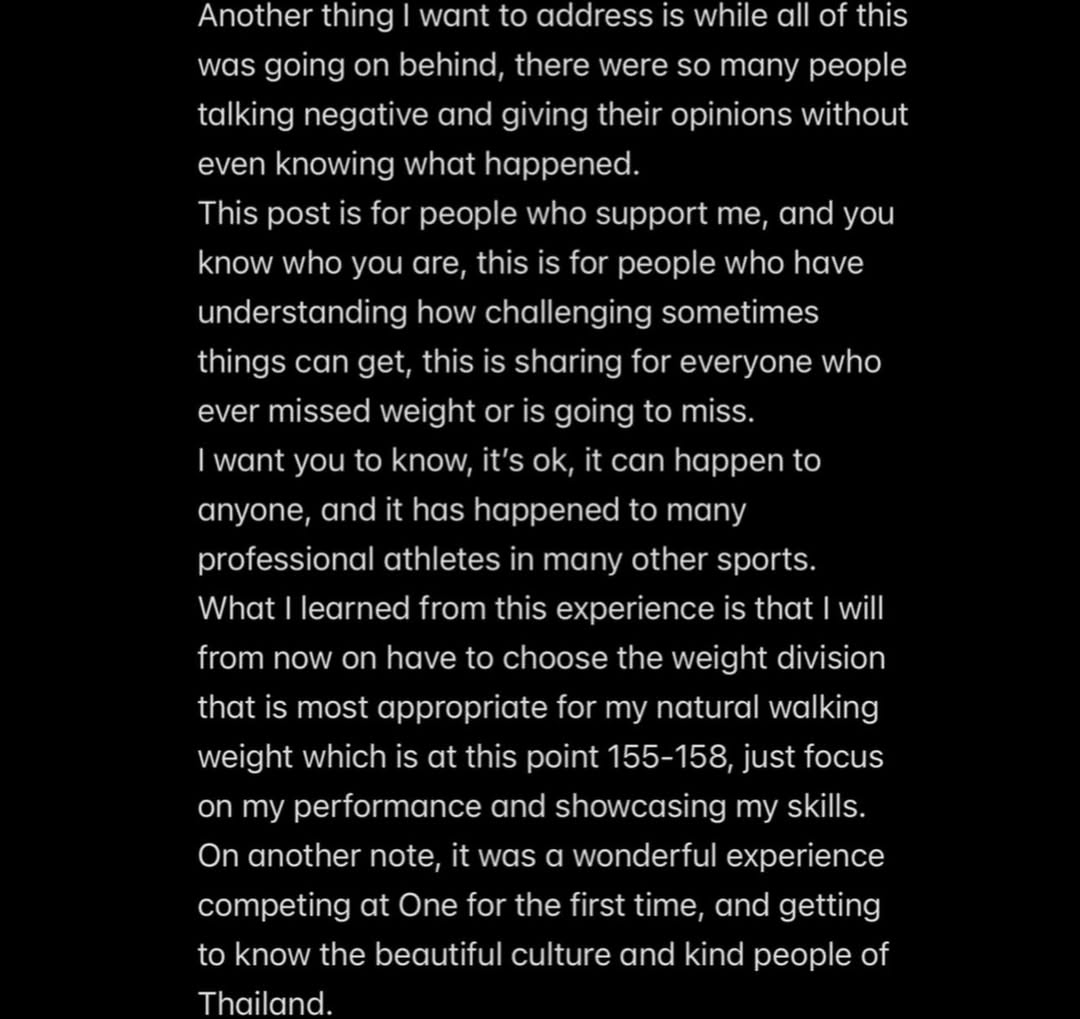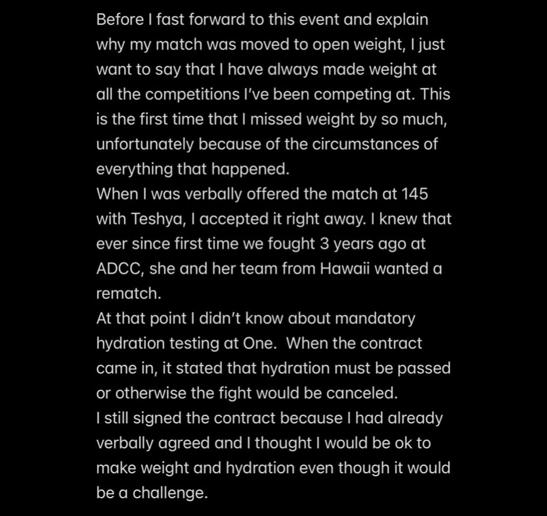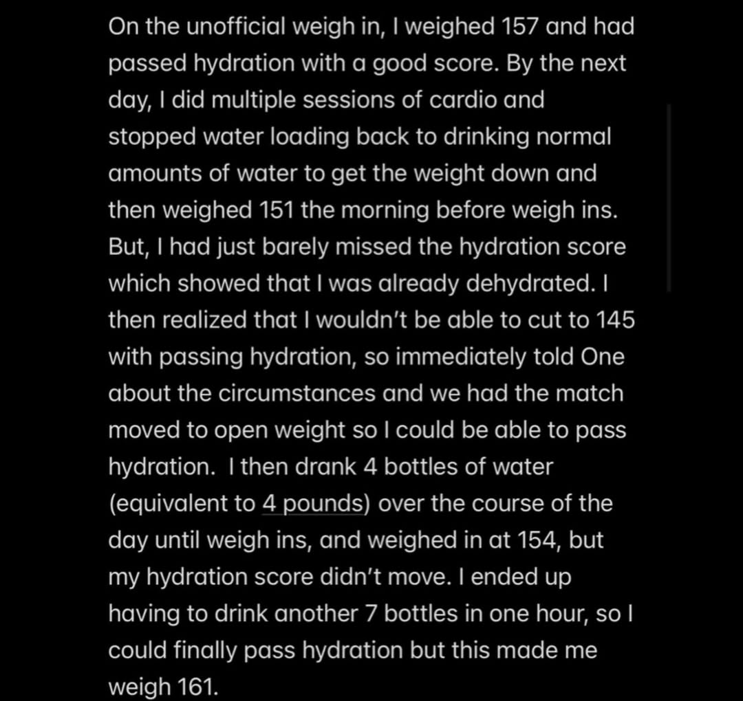 “I realized I wouldn’t be able to cut to 145 while passing hydration, so I immediately informed ONE and the match was moved to open weight.”