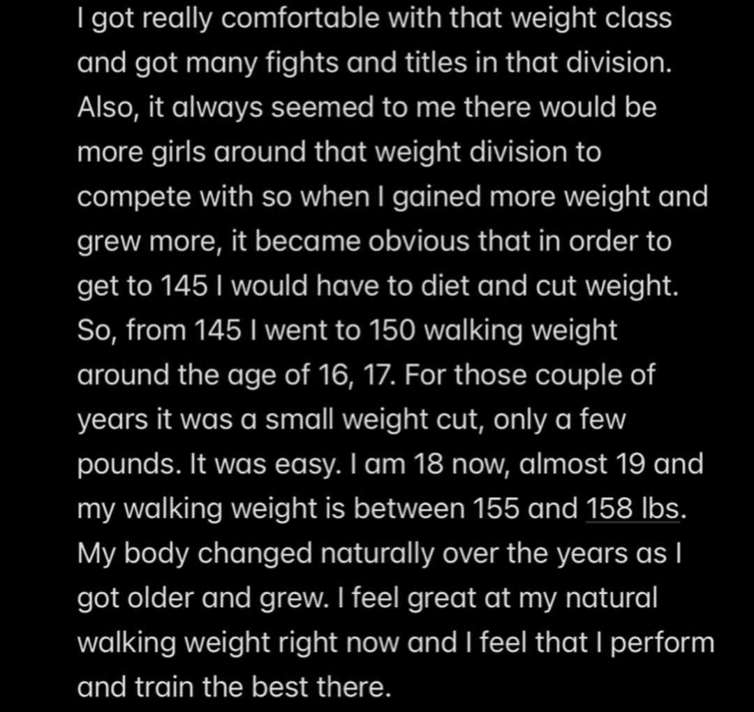 Crevar contextualized the situation within her physical development, noting that while she previously competed comfortably at 145, her natural walking weight has now increased to approximately 155–158 lbs (70–72 kg) as she has grown older.
