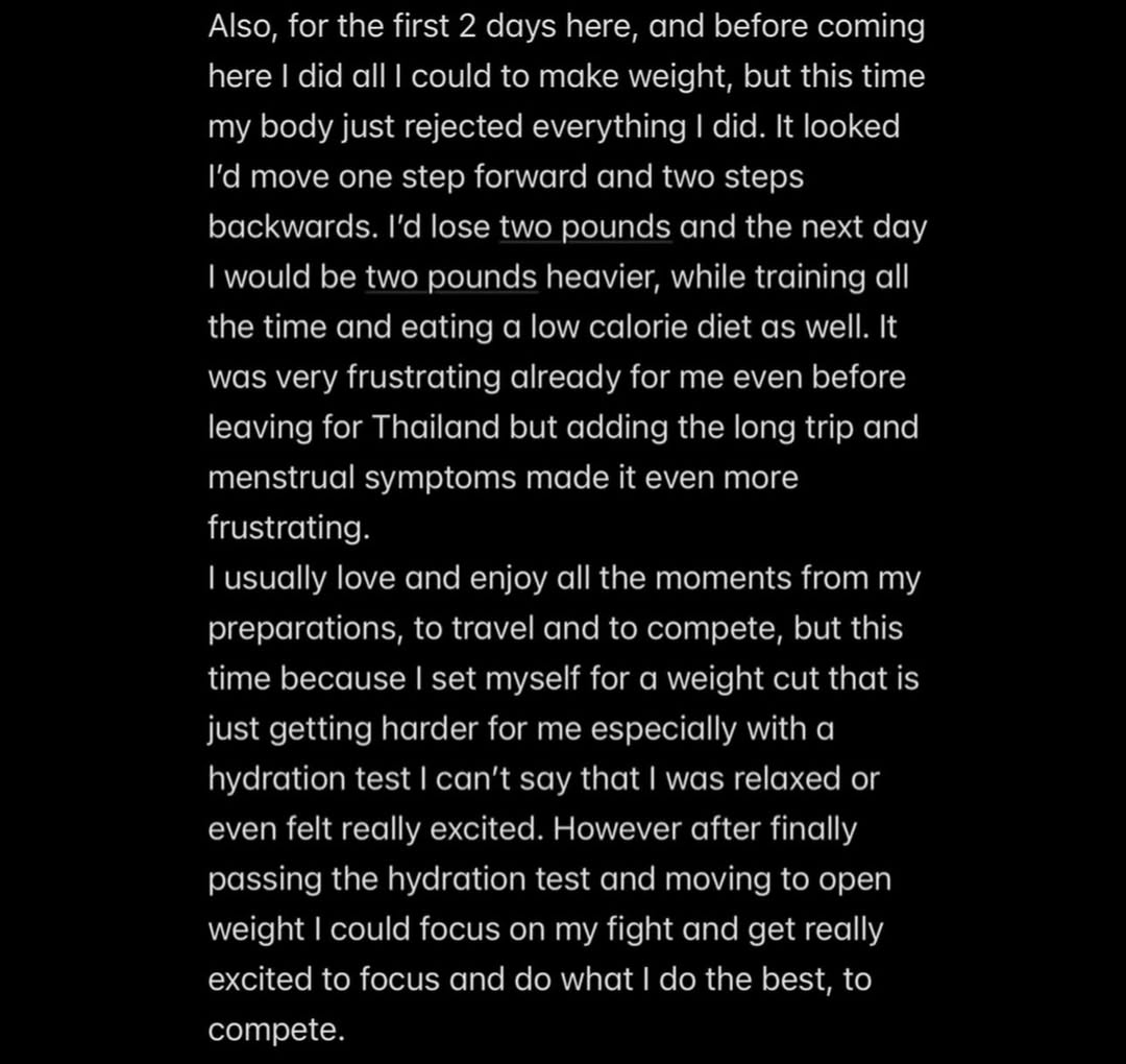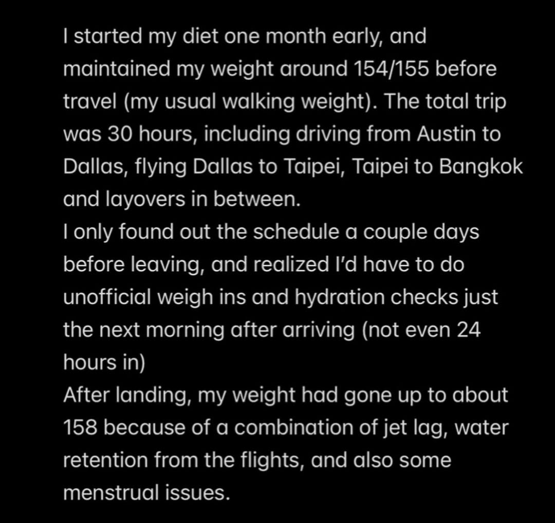 Crevar detailed the logistical and physical strain surrounding the event including a roughly 30 hour travel itinerary from Texas to Thailand, jet lag, water retention and menstrual symptoms, all of which compounded the difficulty of an already demanding cut.