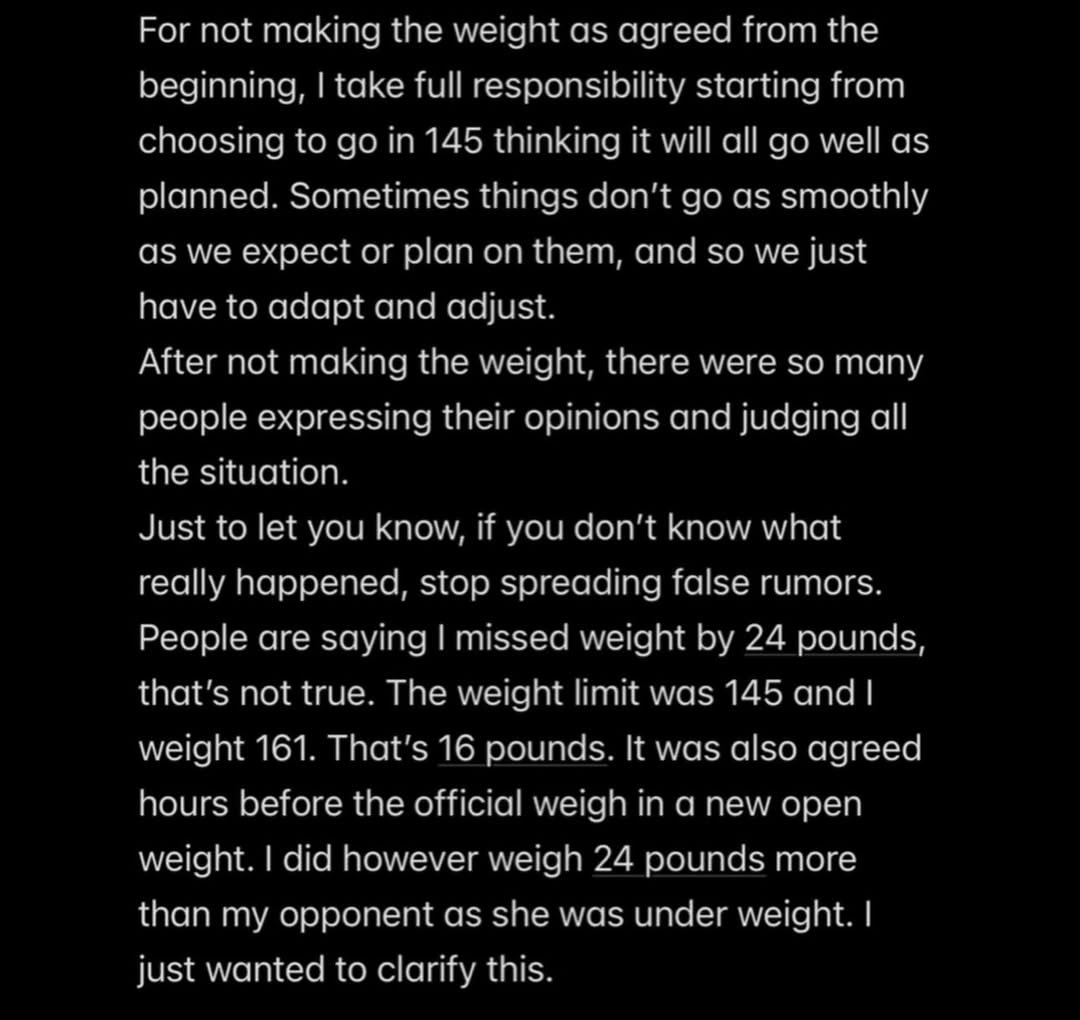 “People are saying I missed weight by 24 pounds—that’s not true. The weight limit was 145 and I weighed 161. That’s 16 pounds.”