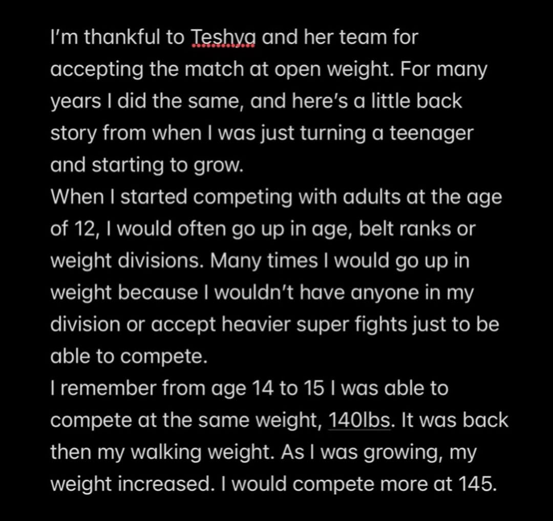 She also expressed gratitude toward her opponent Teshya and her team for accepting the open weight bout, noting that she herself has historically accepted size and age disadvantages to stay active in competition.