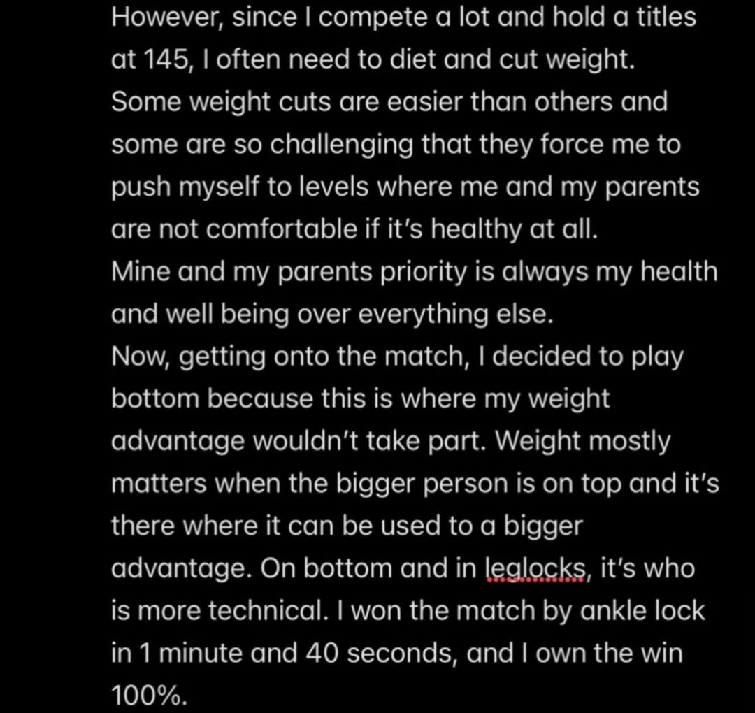 Despite the weigh in controversy, Crevar defended the legitimacy of her performance inside the cage. She stated that she deliberately chose to play from bottom position to minimize any size advantage, emphasizing that technical skill, not weight, determined the outcome.