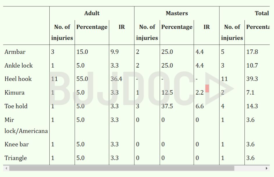 The 2021 competition data showed injured participants had an average age of 30.9 years and an average of 10.1 years of jiu jitsu experience, indicating that even seasoned practitioners remain vulnerable to heel hook related injuries.
