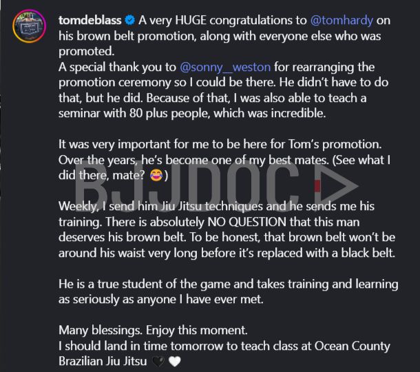 Tom DeBlass shared images online of Hardy wearing his new brown belt, congratulating him on the achievement. The promotion marks the latest step in what has become a serious competitive journey for the Hollywood actor.