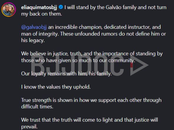 While top competitors fled and the San Diego headquarters announced it was separating the Galvaos immediately and indefinitely from all organizational roles, Eliaquim posted a message of solidarity that cut against the prevailing tide.