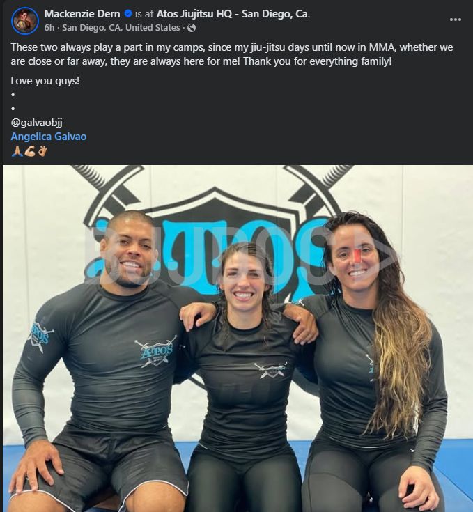 Mackenzie Dern wrote, tagging the location as Atos Jiujitsu HQ in San Diego. The image she shared shows her with Andre and Angelica.