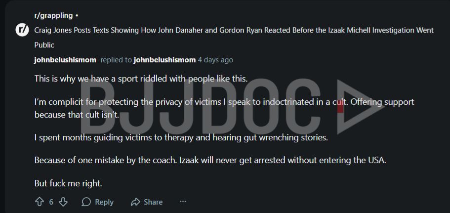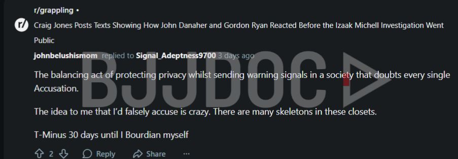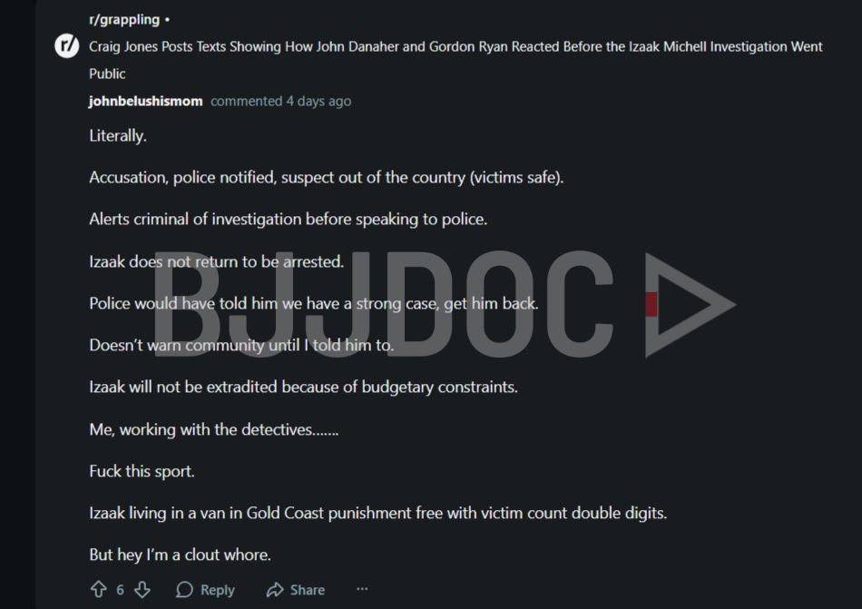 “Izaak living in a van in Gold Coast punishment free with [count] double digits,” Jones wrote on the r/grappling subreddit, addressing critics who have questioned his handling of the situation.