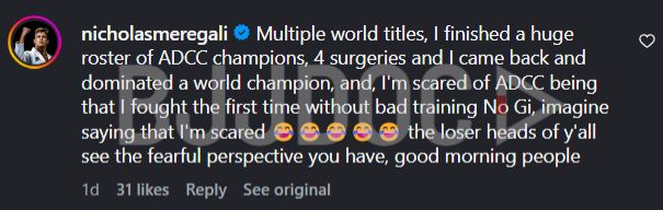 “Multiple world titles, I finished a huge roster of ADCC champions, 4 surgeries and I came back and dominated a world champion, and I’m scared of ADCC? Being that I fought the first time without bad training No Gi, imagine saying that I’m scared. The loser heads of y’all see the fearful perspective you have, good morning people.”