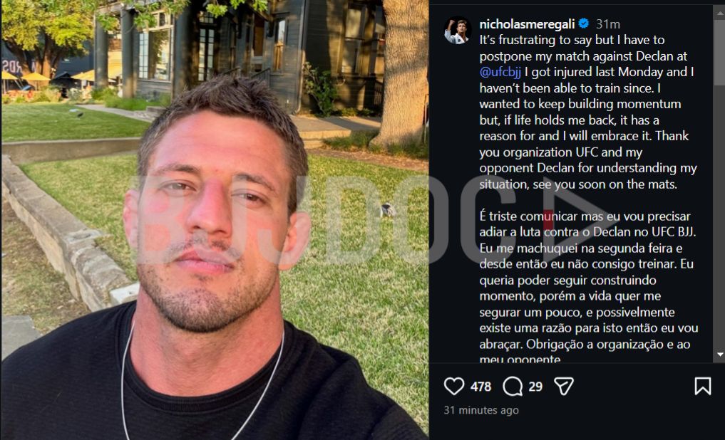 Meregali’s UFC BJJ 7 appearance has been derailed. Earlier today he announced that due to injury he’s unable to compete against Declan Moody.