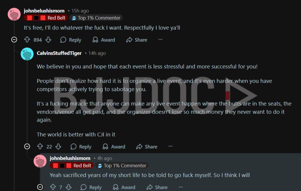 Jones and the CJI camp appear unmoved by that line of thinking. When a separate commenter pushed back on the idea of adding more weight classes, suggesting it would give smaller competitors a fairer shot at the prize money, Jones responded with a single word: “No.”