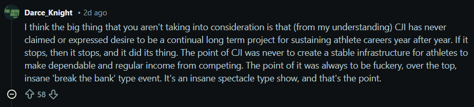 As one commenter in the thread put it, “CJI has never claimed or expressed desire to be a continual long term project for sustaining athlete careers year after year. The point of CJI was never to create a stable infrastructure for athletes to make dependable and regular income from competing. The point of it was always to be f**kery, over the top, insane ‘break the bank’ type event. It’s an insane spectacle type show, and that’s the point.”