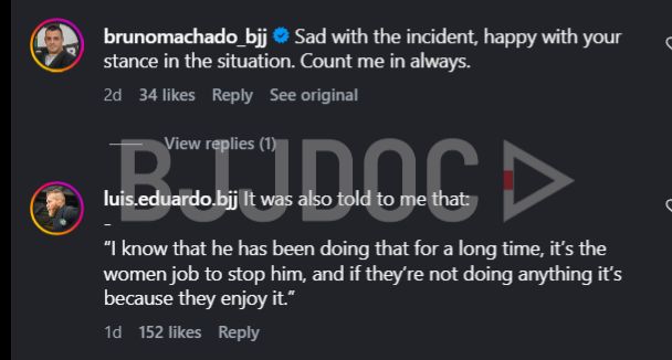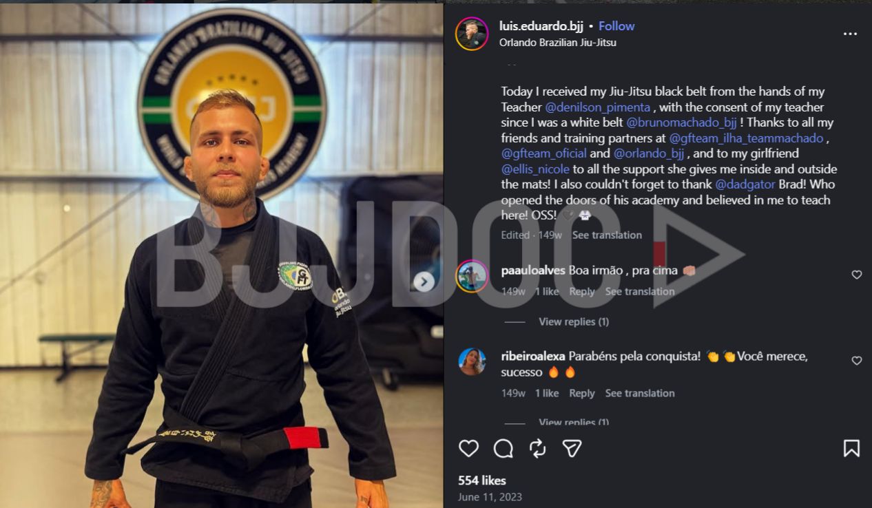 Eduardo received his black belt in 2023 from Denilson Pimenta, with the endorsement of his longtime teacher Bruno Machado, under whom he had trained since his white belt days. Machado, affiliated with GFTeam, responded publicly to the statement with unambiguous support: