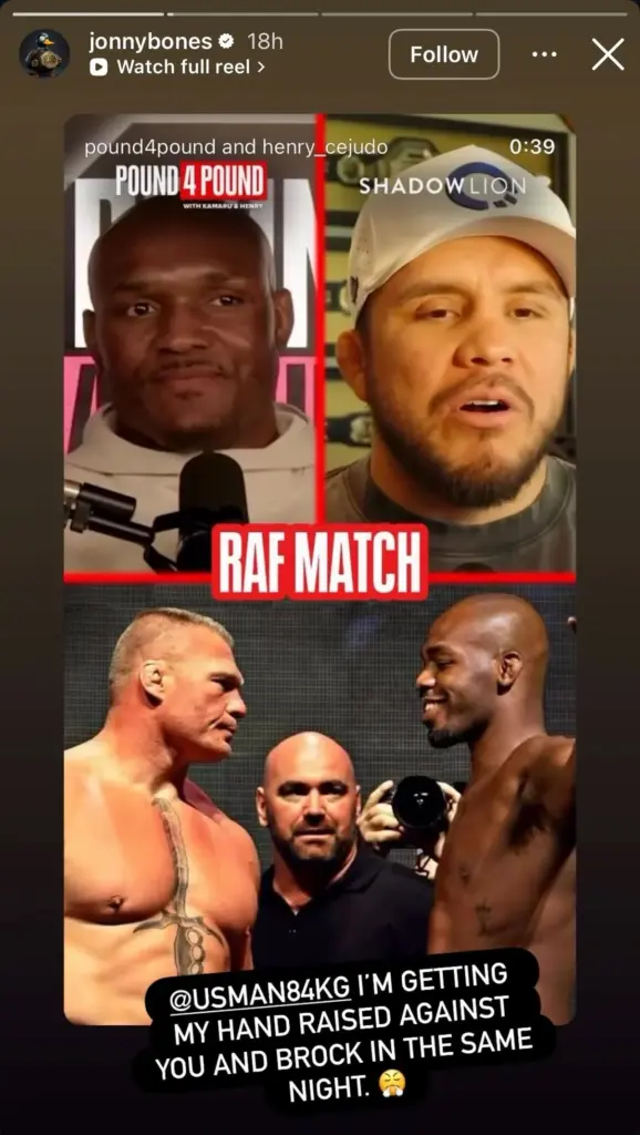 “I’m getting my hand raised against you and Brock at the same time,” Jones wrote tagging Usman in his Instagram story.