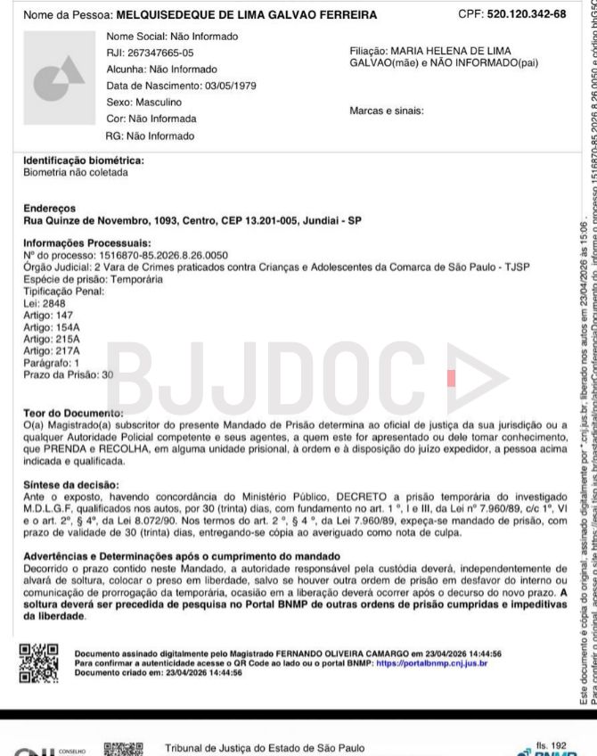 Documentation reviewed by this outlet through the Brazilian legal database Jusbrasil.com.br points to a prison warrant issued by the Court of Justice of the State of São Paulo, specifically through its specialized court handling cases involving children and adolescents in the county of São Paulo. The alleged arrest warrant references three counts under Law 8.069/90, Brazil’s Child and Adolescent Statute, alongside Law 13.441/2017. Issued under the authority of the National Council of Justice (CNJ), the document directed law enforcement to seek police assistance if necessary to bring Galvao before the issuing judge.